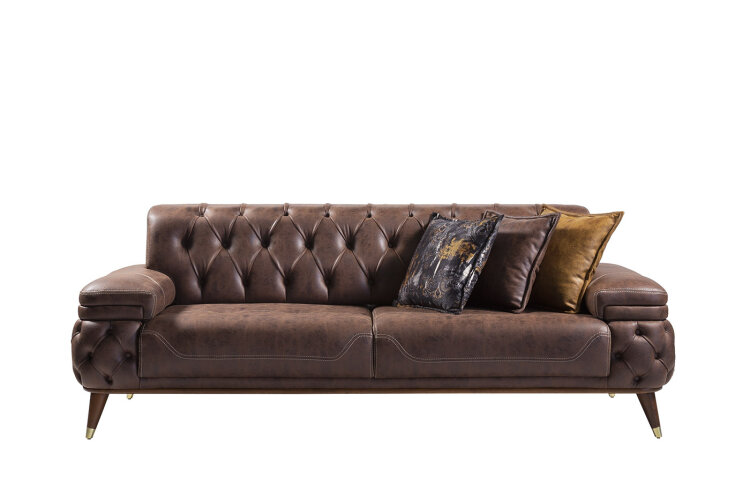Polyester içerikli, deri görünümlü nubuk kumaşı; şık duruşunun yanında kolay temizlenebilir yapısıyla da öne çıkıyor.Yumuşak oturum yapısına sahip takımda, 30 DNS sert sünger kullanılarak uzun ömürlü konfor sağlanmıştır.