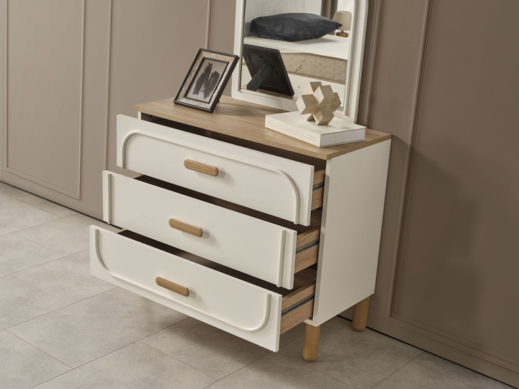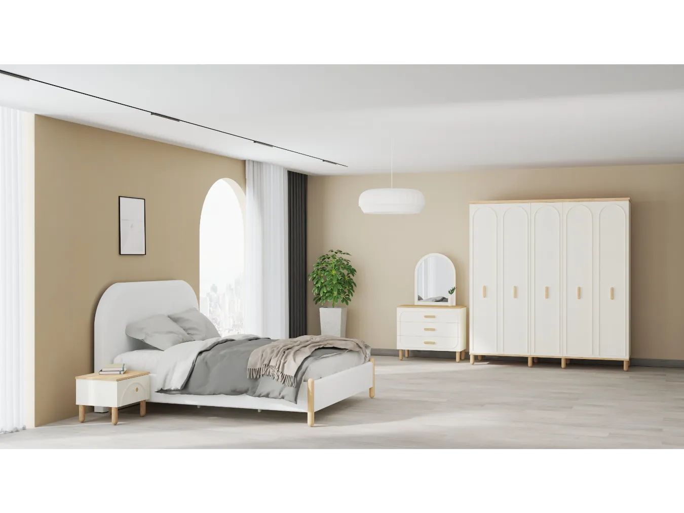 Zarif ve Fonksiyonel Tasarım Bohem yatak odası takımı, yalın hatları ve detaylı işçiliği ile odanızda sade ve zarif bir atmosfer yaratır. 200 cm genişliğindeki kapaklı gardırop, odanın genel düzenini korumanıza yardımcı olurken, aynı zamanda modern tasarımıyla da göz doldurur. Takımdaki her bir parça, estetikle fonksiyonelliği dengeli bir şekilde sunar.